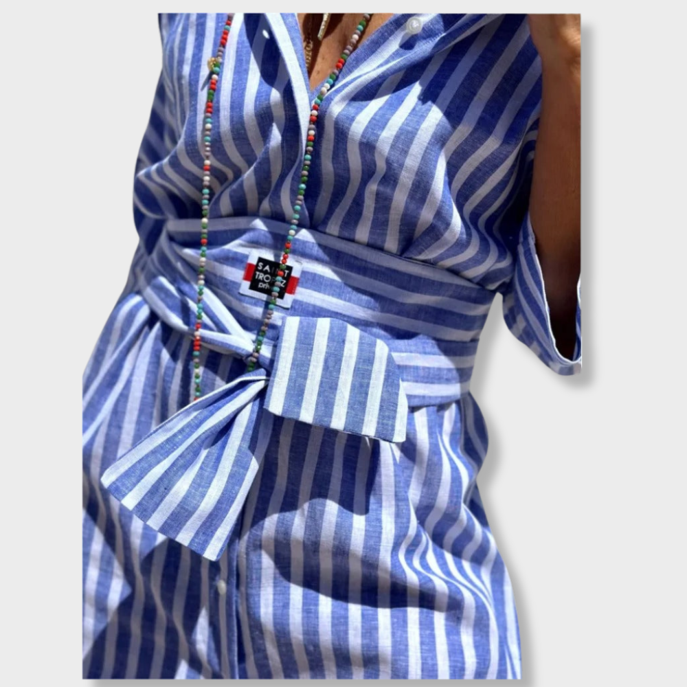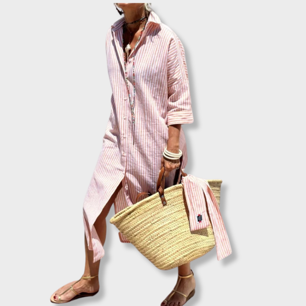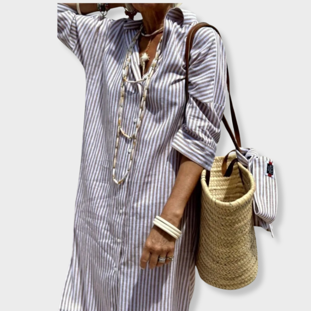 Przenieś swój styl na wyższy poziom z sukienką Denise w paski. Ta niezwykła sukienka łączy ponadczasową elegancję z codziennym komfortem, doskonale sprawdzając się w każdej sytuacji – od biura po wieczorne wyjścia. Jej lekki, luźny krój zapewnia swobodę ruchów, a elegancki kołnierz dodaje szyku. Idealna na każdą porę roku!